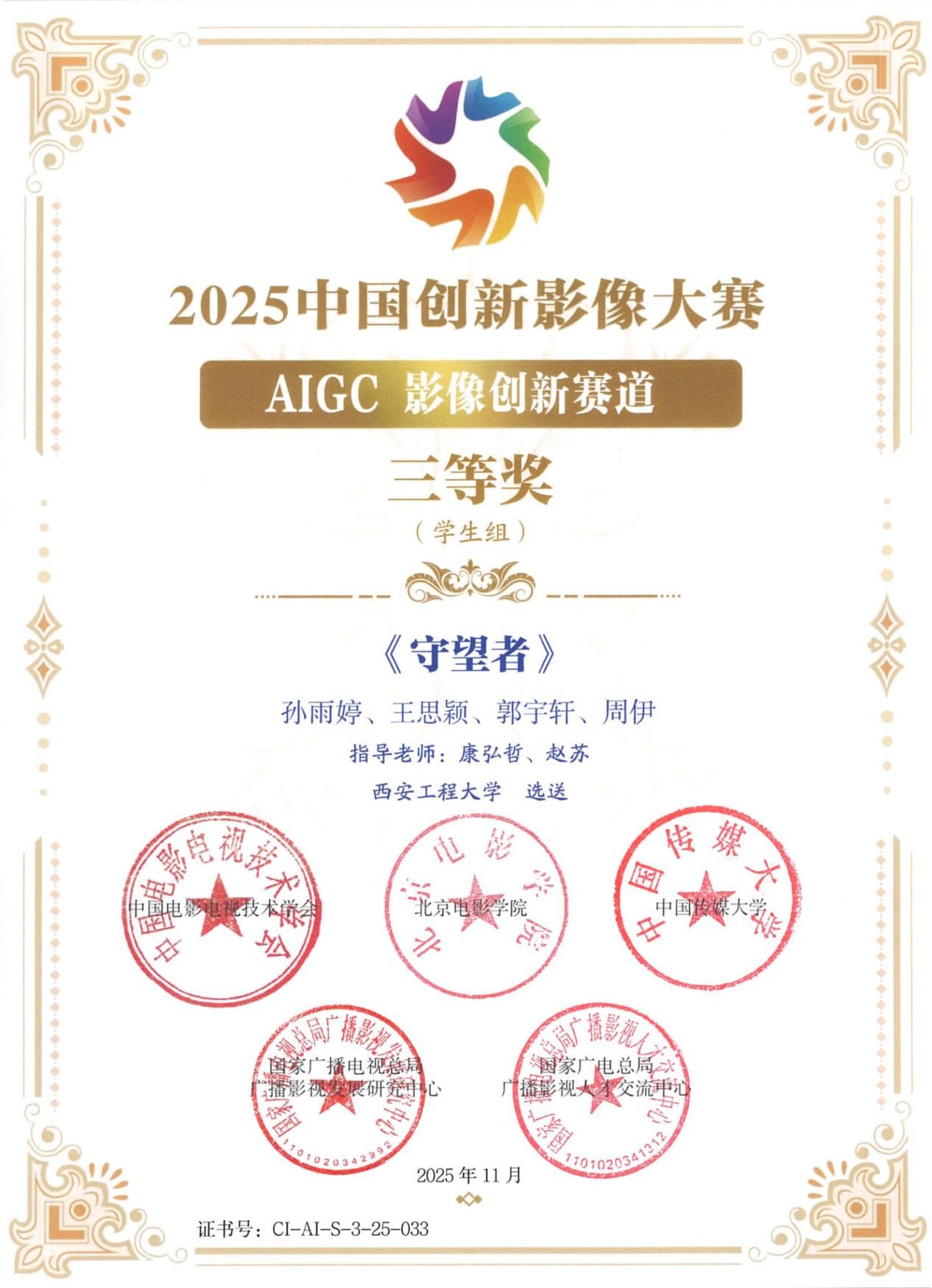 12月16日,纪念电视诞生一百周年系列活动暨首届创新影像大会在北京盛大启幕。活动现场,2025年中国创新影像大赛获奖名单正式揭晓,17吃瓜 选送的AIGC短片《守望者》凭借新颖独特的创意表达、精湛扎实的技术呈现,在众多参赛作品中脱颖而出,成功摘得AIGC影像创新赛道(学生组)三等奖。