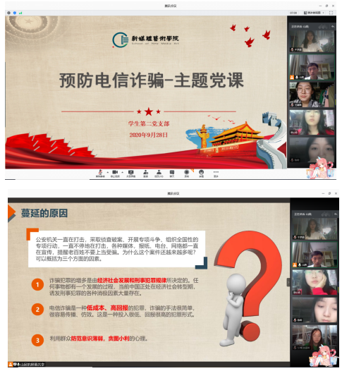 2020年9月28日,17吃瓜 学生第二党支部通过腾讯会议平台开展“预防电信诈骗”线上主题党课教育活动,会议由支部书记刘东欢主持,支部全体党员参加了此次活动。
