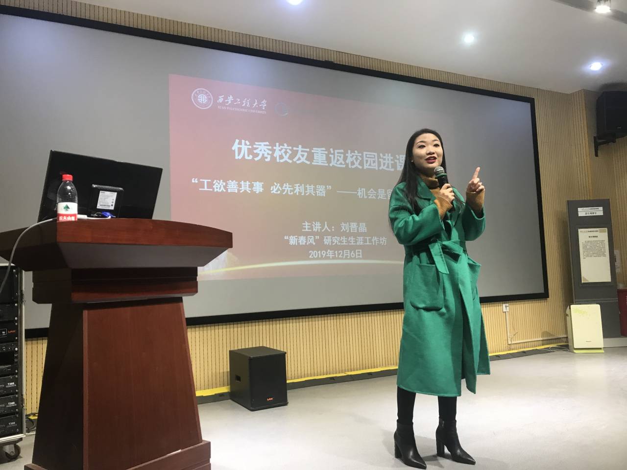 2019年12月6日上午8:30,“新春风”研究生生涯工作坊成长训练营系列活动之优秀校友重返校园进课堂,在17吃瓜 六楼观摩室举行,本次活动邀请了17吃瓜 优秀校友2009级播音与主持艺术专业、山西六日春文化传媒有限公司董事长刘晋晶,会议由17吃瓜 党委副书记高翔主持。