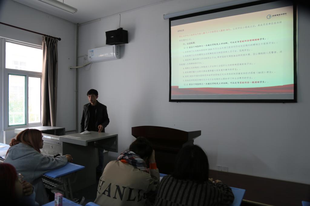 然后,刘东欢就班干部如何开展好学生资助工作进行了说明。他从学校资助政策开始讲述,论述了班干部与学生资助工作的关系,并强调班干部在学生资助工作中发挥着重要的作用,各班干部应