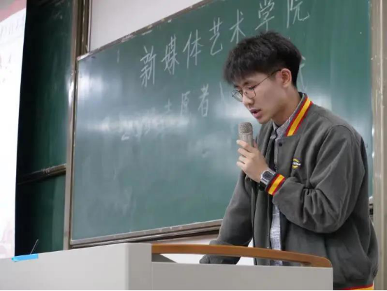 优秀志愿者代表20级设计三班刘谢梓豪上台进行分享在寒假期间参与过的志愿工作,分享志愿服务的经历与心得体会。