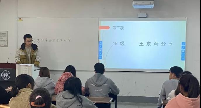 接下来19级助理王东海学长做出了工作分享,王东海结合自身做助理的经验和大家分享了材料整理的规范性和学生助理工作态度的重要性。他希望学弟学妹能继续保持学工办助理的优良作风,做好传帮带,让学办助理团队成为一支高效协作的团队。