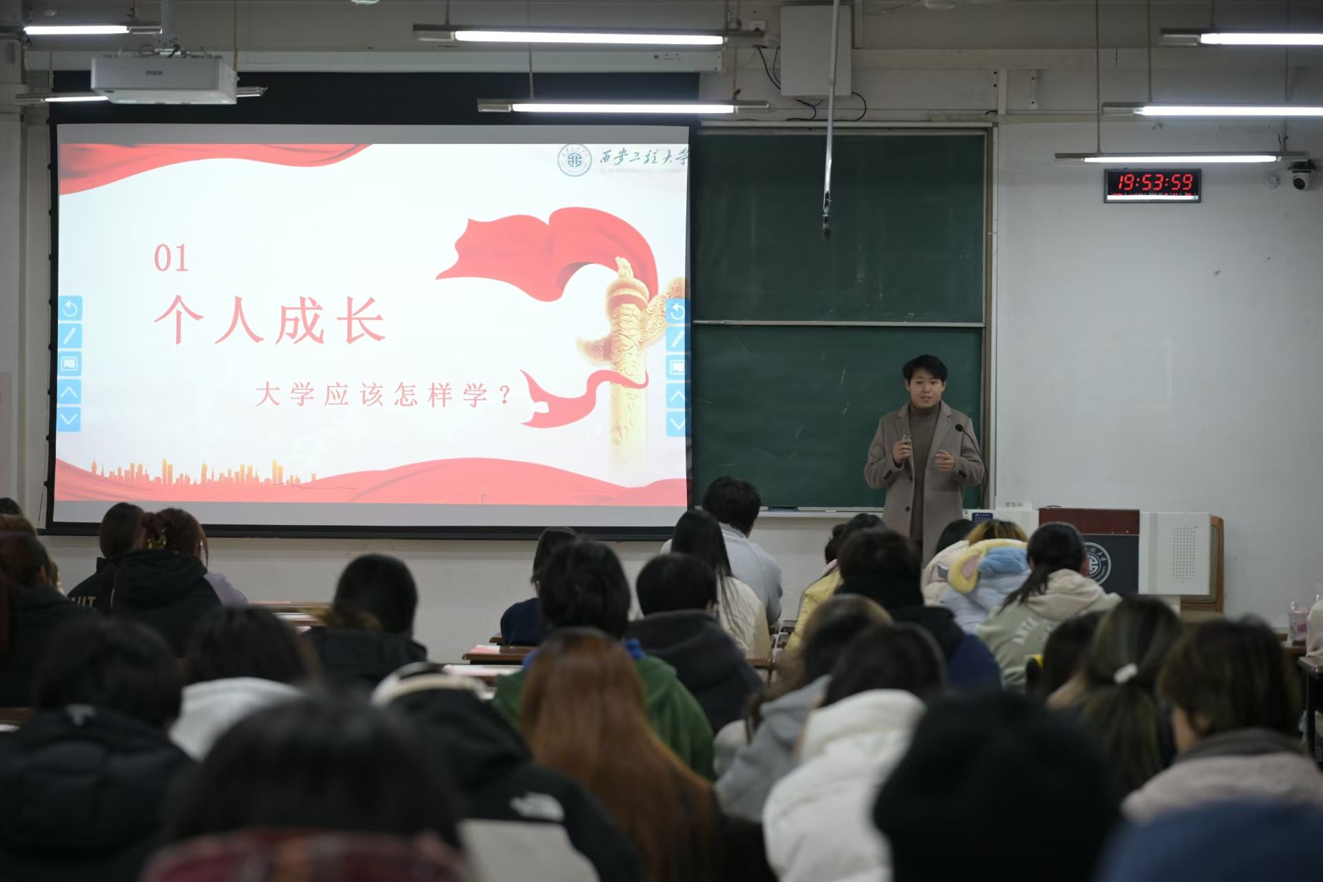 在人生成长方面,姜北学长通过展示自己的PS绘画作品、参赛经历向大家说明大学生活要玩出成绩,玩出精彩,去见世界,踏千里,寻人生。同时也结合自身经历向学弟学妹们分享了大一期末选专业的心得体会,向同学们强调专业知识能力以及综合素质测评的重要性,希望学弟学妹能够有所获、有所得。