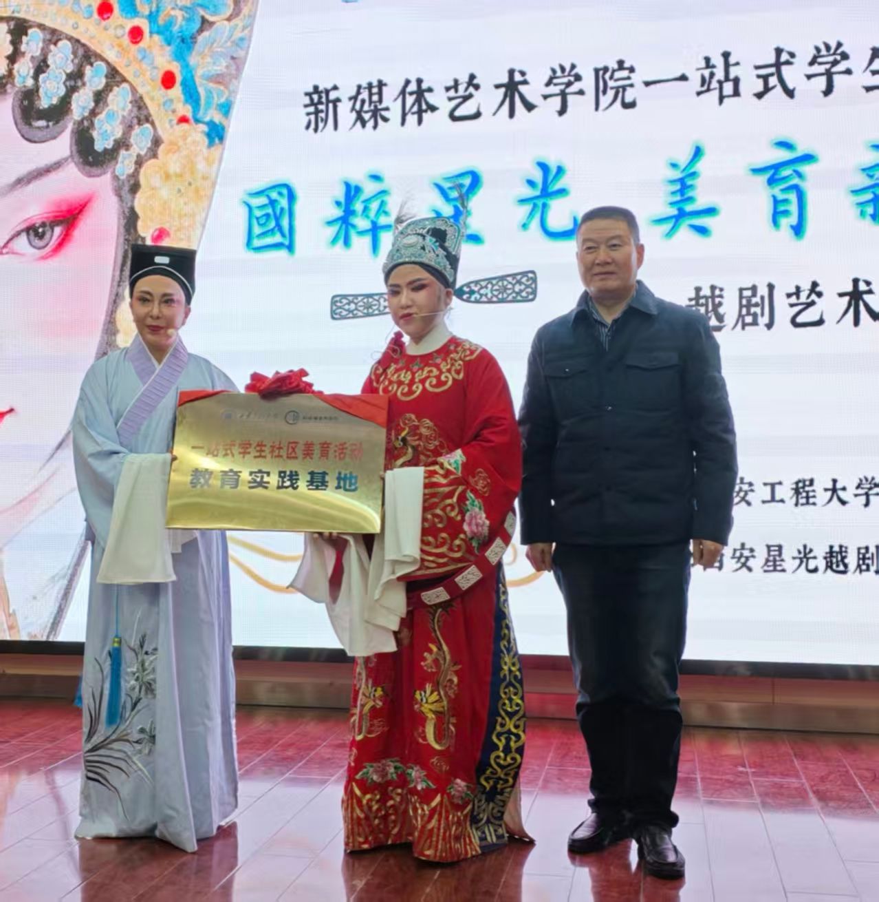 活动伊始,学院党委书记张瑾致辞,他对西安星光越剧团的到访表示热烈欢迎,强调了“高雅艺术进校园”活动以美育人、以美化人、以美培元的活动宗旨,并表示将以此次活动为契机,扎实落实立德树人根本任务,不断推进学校人才培养质量,为学校高质量发展做出应有的贡献。致辞结束后,现场举行了“17吃瓜 一站式学生社区美育浸润活动实践基地”授牌仪式,学院领导为星光越剧团团长韩若梦、副团长韩菁授牌,标志着双方将在戏曲文化传播、美育实践活动等方面开展更深层次的合作。星光越剧团也向学院领导送上了定制的《梁祝》剧照台历,以作友谊纪念。