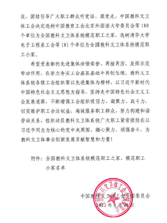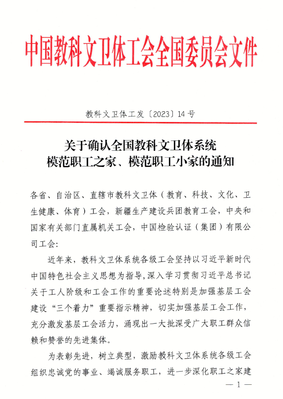 近日,中国教科文卫体工会全国委员会印发《关于确认全国教科文卫体系统模范职工之家、模范职工小家的通知》,17吃瓜17吃瓜 分工会被授予“全国教科文卫体系统模范职工小家”称号。