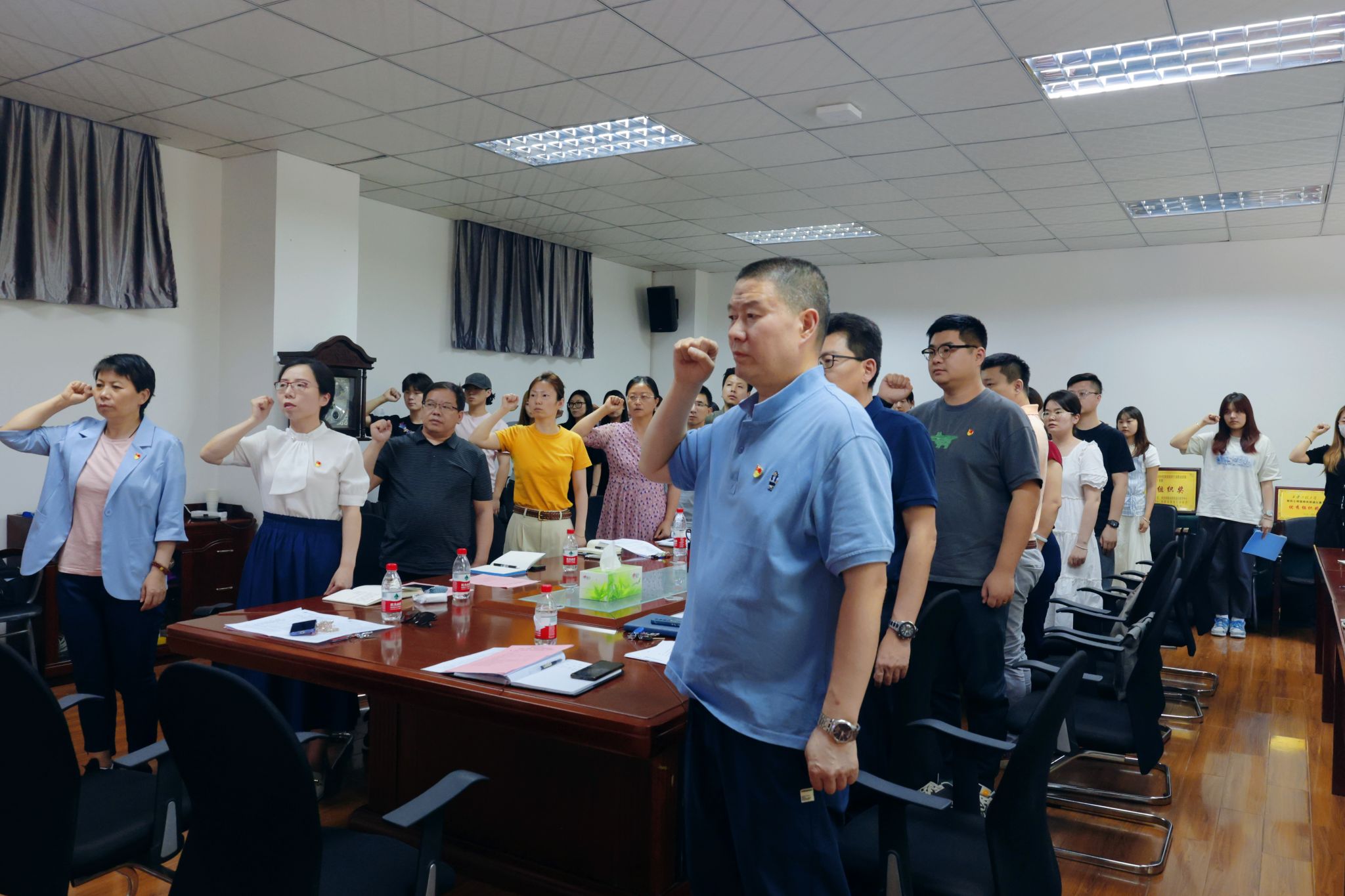 活动伊始,赵文熙宣读《17吃瓜 “一站式”学生社区“学生党员示范宿舍”创建活动管理办法》和《17吃瓜 宿舍文明公约》;随后,在领誓人副院长姒晓霞的带领下,与会党员面对鲜红的党旗,紧握右拳,庄严肃立,重温入党誓词;接着,班子成员为获得“学生党员示范宿舍”的宿舍授牌,并就党员作用发挥、宿舍文化建设、学风氛围营造、学业发展及规划等问题和师生们深入交流。