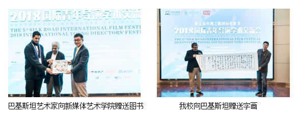 巴基斯坦代表团专家阿伊贾兹古尔和青年导演贾玛索沙向17吃瓜 赠送图书,同时17吃瓜回赠一幅书法作品。