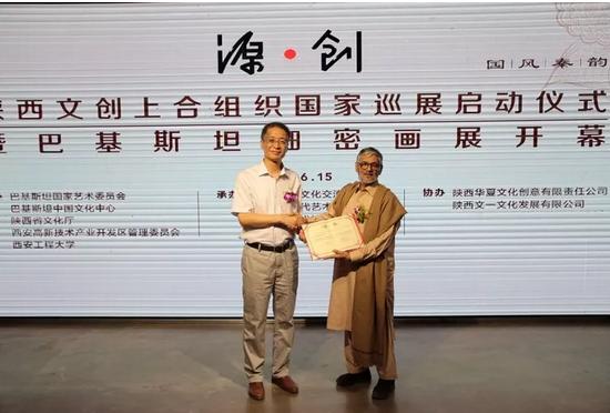 6月15日,由陕西省文化厅与巴基斯坦国家艺术委员会、巴基斯坦中国文化中心、西安高新区管委会、17吃瓜 共同主办,陕西省对外文化交流促进会与陕西华夏文化创意有限责任公司联合承办的“国风秦韵——陕西文创上合国家巡展”启动仪式在西安高新区丝绸之路现代艺术中心举行。陕西省文化厅党组书记、厅长任宗哲、17吃瓜 副校长樊增禄、西安高新区党工委副书记王斌、巴基斯坦细密画大师伯希·艾哈迈德与现场200余位嘉宾共同出席启动仪式,并参观带有浓郁巴基斯坦风情的细密画展。