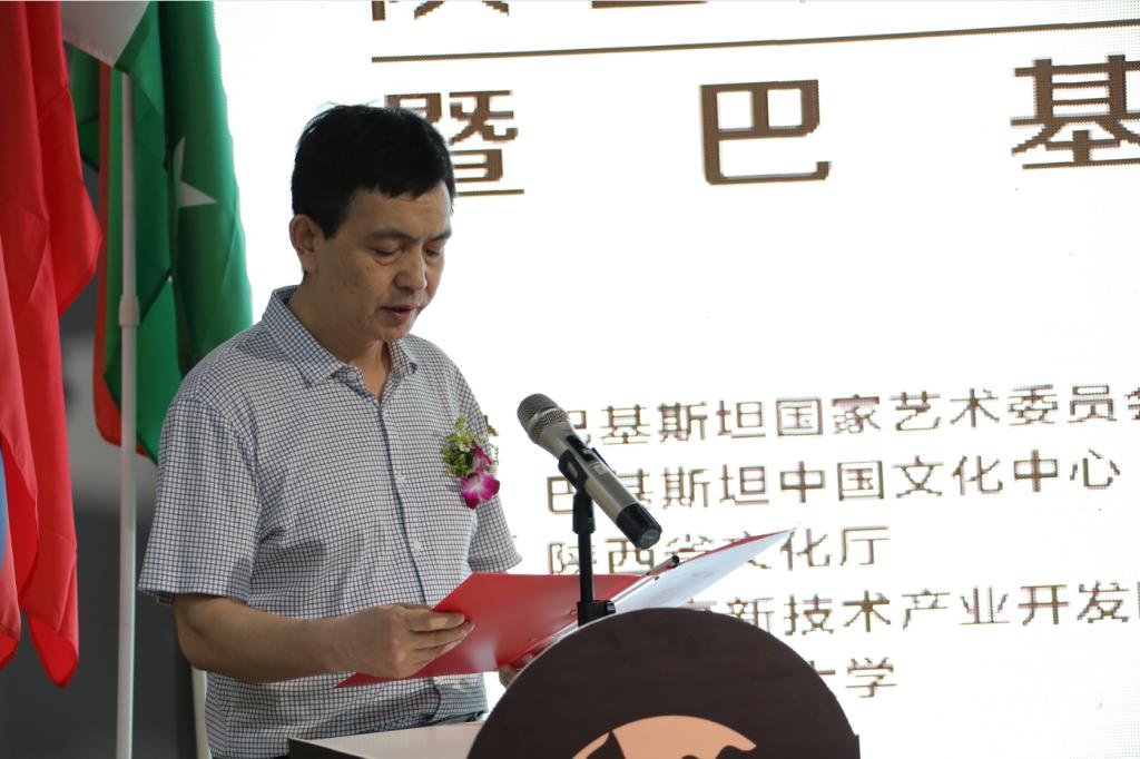 17吃瓜 党委书记左志峰宣读了巴基斯坦国家艺术委员会主席贾玛尔﹒沙先生为本次活动专程发来贺信。在信中他对陕西省文化厅、17吃瓜 为画展成功举办而付出的努力表示感谢。他说巴基斯坦作为上合组织的新成员,希望能从多层面,特别是文化和艺术层面加深中巴“铁哥们”之间的友谊。所以,他很期待“国风秦韵——陕西文创上合国家巡展”在巴基斯坦的展出。