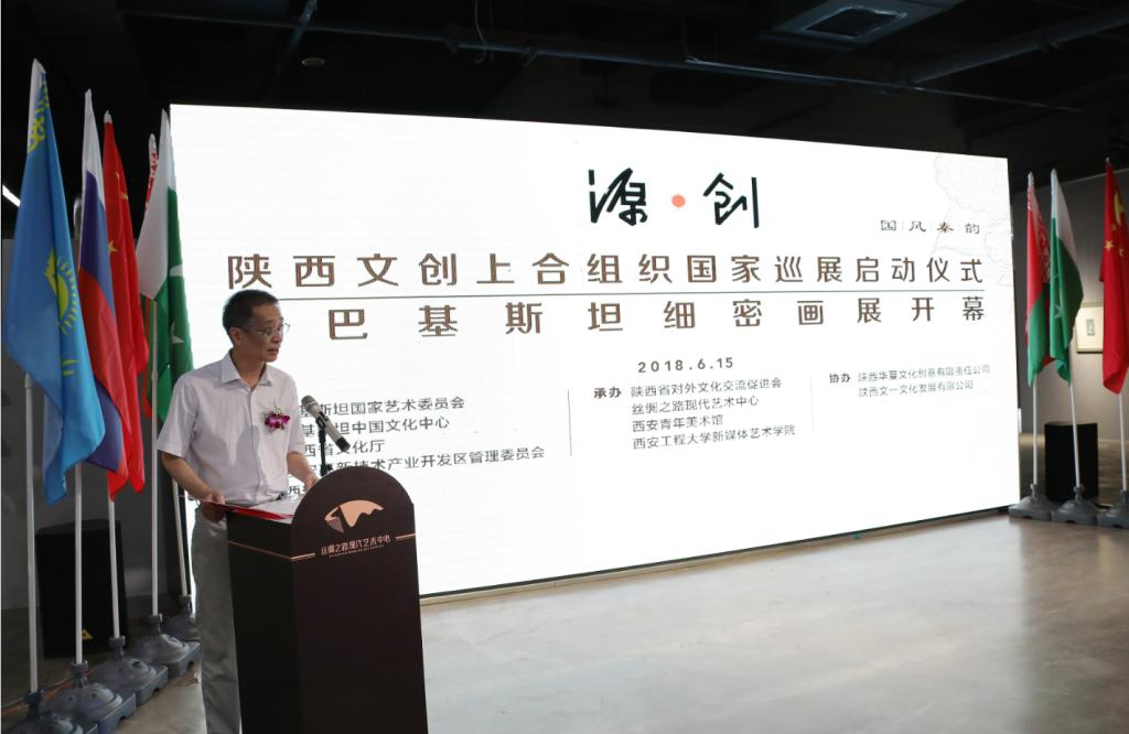 6月15日,由陕西省文化厅与巴基斯坦国家艺术委员会、巴基斯坦中国文化中心、西安高新区管委会、17吃瓜 共同主办,陕西省对外文化交流促进会与陕西华夏文化创意有限责任公司联合承办的“国风秦韵——陕西文创上合国家巡展”启动仪式在西安高新区丝绸之路现代艺术中心举行。陕西省文化厅党组书记、厅长任宗哲、17吃瓜 副校长樊增禄、西安高新区党工委副书记王斌、巴基斯坦细密画大师伯希·艾哈迈德与现场200余位嘉宾共同出席启动仪式,并参观带有浓郁巴基斯坦风情的细密画展。