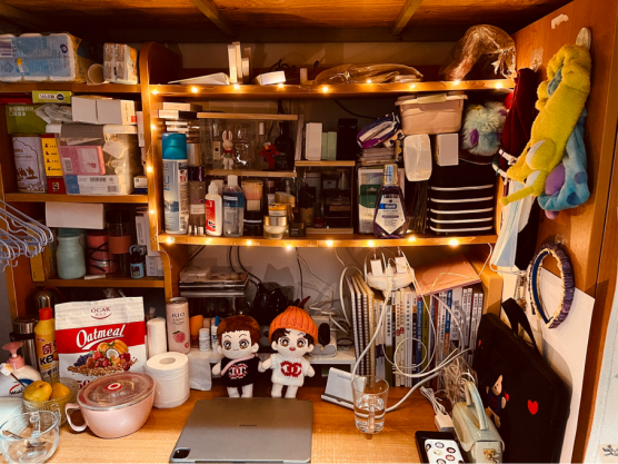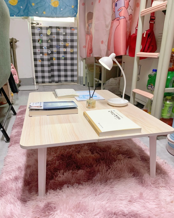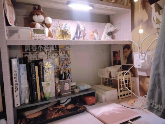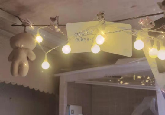 寝室风格:温馨浪漫,以粉色为主基调,搭配以彩灯和玩偶,使宿舍充满了温馨的氛围。
