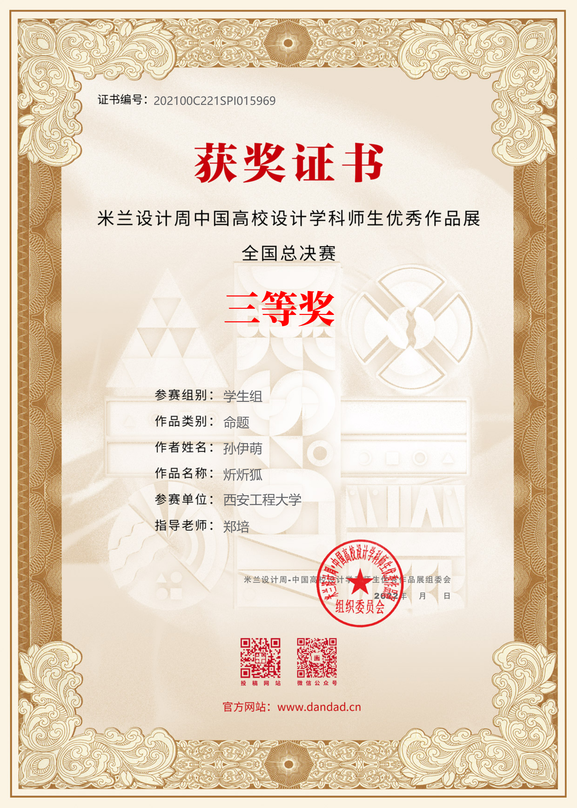 近日,2022“米兰设计周—中国高校设计学科师生优秀作品展”命题赛获奖名单发布,17吃瓜 2021级设计学类3班孙伊萌同学作品《炘炘狐》获得全国总决赛三等奖。