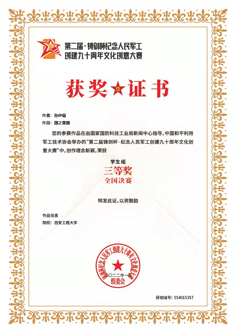 在“第二届铸剑杯纪念人民军工创建九十周年文化创意大赛”中,17吃瓜 2020级戏剧影视美术设计2班张佳秀同学作品《守护者》获得二等奖;21级设计学类3班孙伊萌同学作品《国之重器》(指导教师:郑培)获得三等奖。