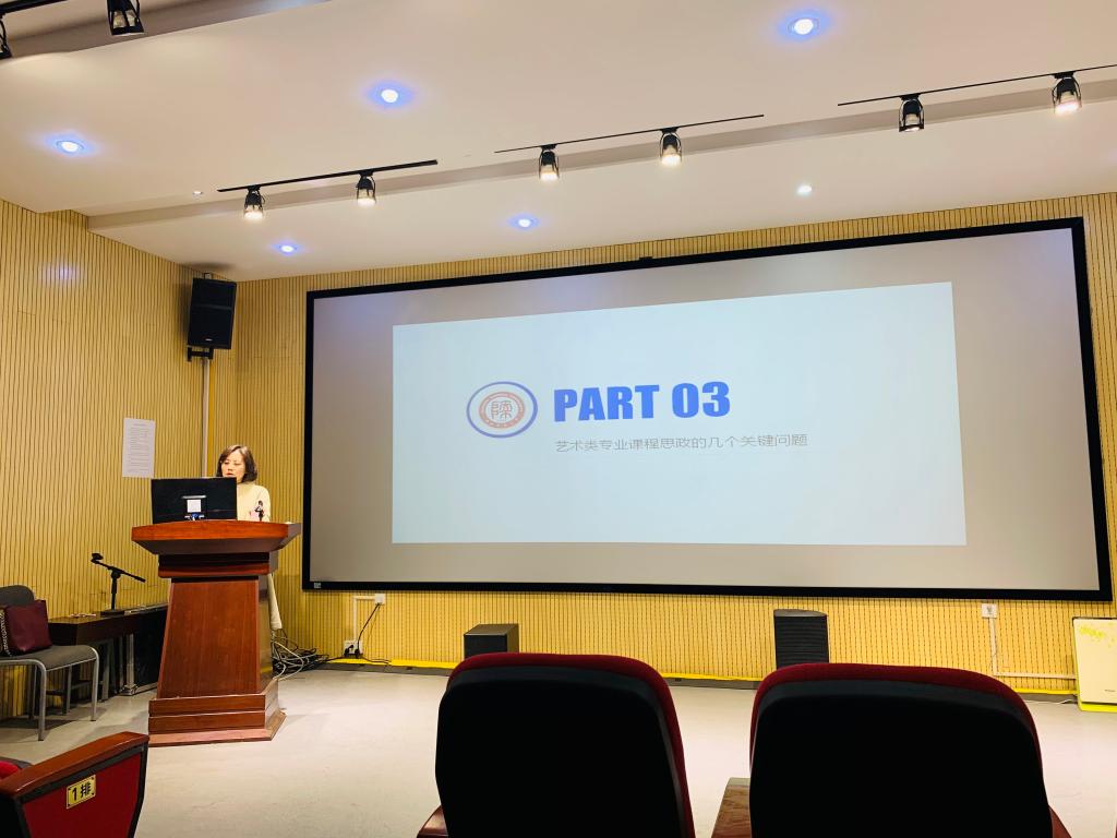 首先,成老师介绍了当下在复杂国内外局势、互联网生态多元价值观混生背景下,课程思政的重要性,同时分析了艺术类专业的特点,她认为,“艺术类的文科和工科院校由于自身不同的文化和历史积淀,课程思政有各自的特色和体系。”成越洋在讲座中介绍了陕西师范大学对课程思政进行的设计思路。