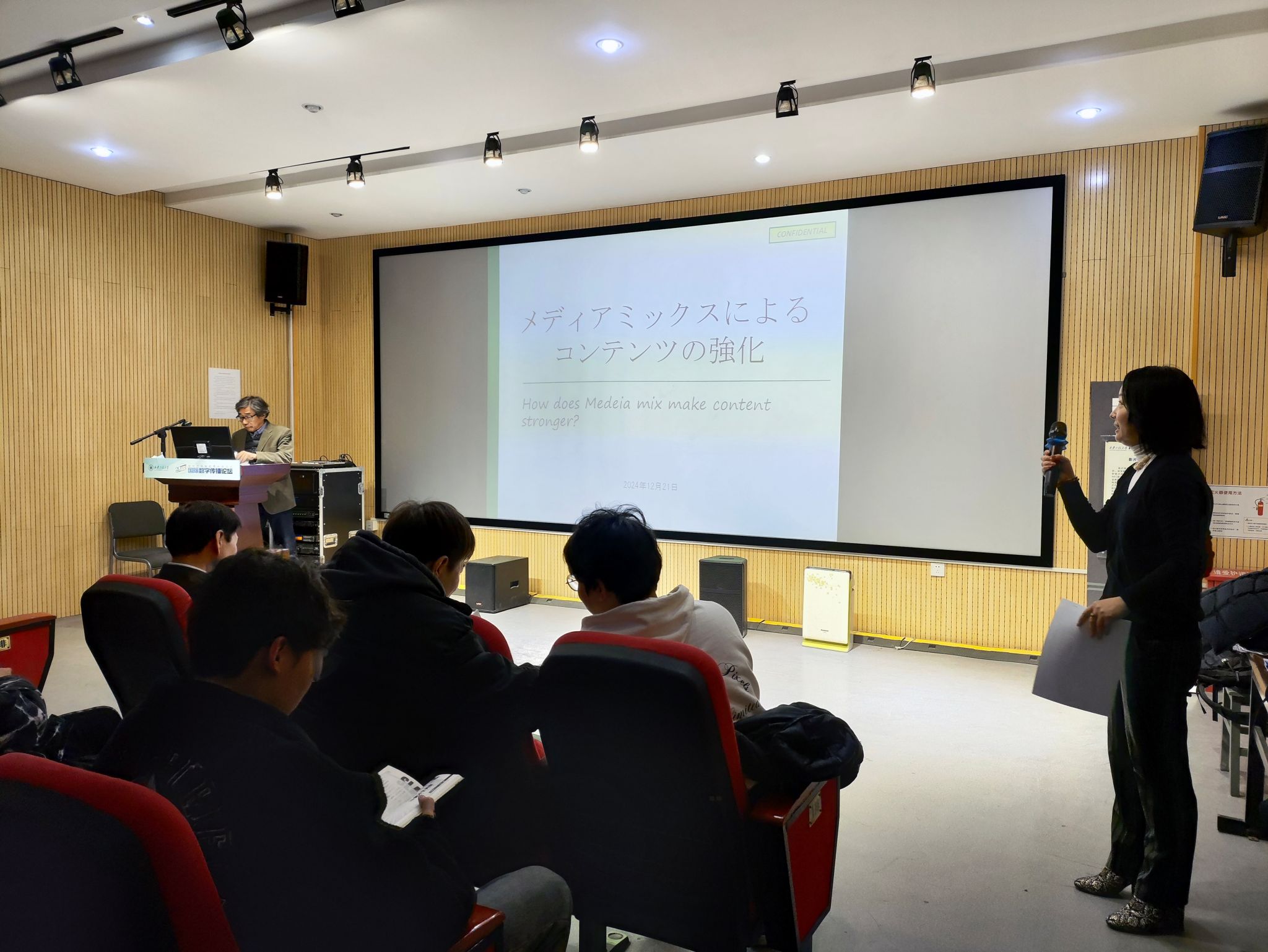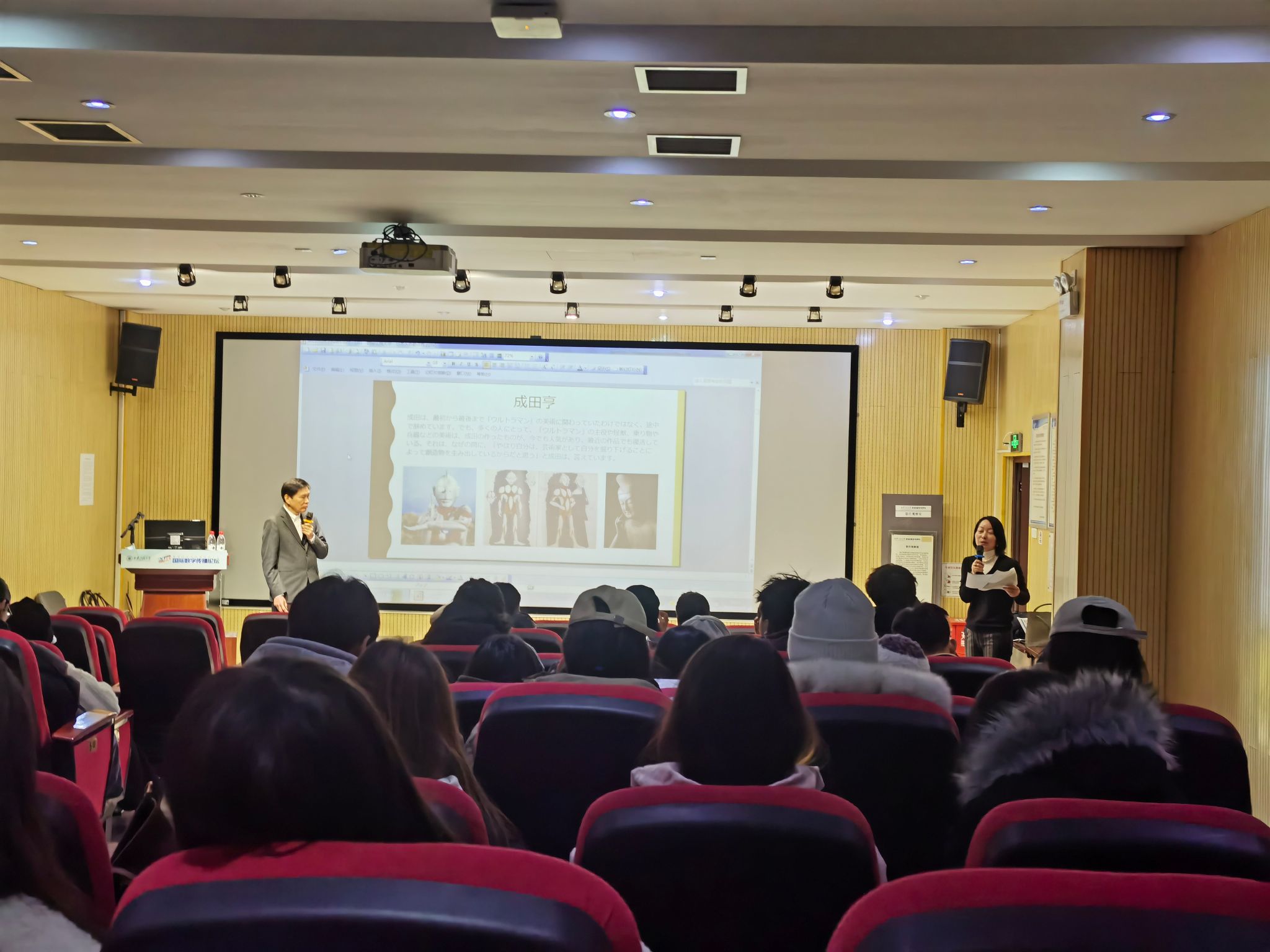 高桥克三、吉田隆两位老师面向17吃瓜 师生分别开展专题学术讲座。高桥克三老师讲述了成田亨、高山良策、小林七郎三位日本代表性艺术家创作家喻户晓的奥特曼、特斯拉的过程,播放了部分珍贵视频,并讲述了中国文化对日本文化的深刻影响,以及两国之间语言表达的相同之处。吉田隆老师介绍了日本的动漫、游戏、杂志如何延伸为影响世界的流行文化,并现场分享了中日间最流行的动漫杂志和书籍,以及如何通过一本书籍或者文学作品找到作品的灵感及叙事方法。
