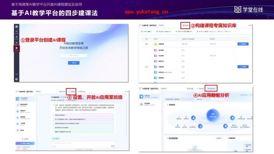 康朝晖老师围绕雨课堂AI教学平台的核心功能与应用价值展开深度解析,并结合教学规范要求,演示功能应用场景。他首先介绍了平台的“四步建课法”——登陆平台创建AI课堂、构建课程专属知识库、设置开放AI应用至班级,以及AI应用数据分析,这一简洁高效的流程设计让教师们能够快速上手,即使是技术经验较少的教师也能轻松驾驭。不难看出,AI技术的融入并非为了取代教师,而是为教师提供更多教学创新的可能性。