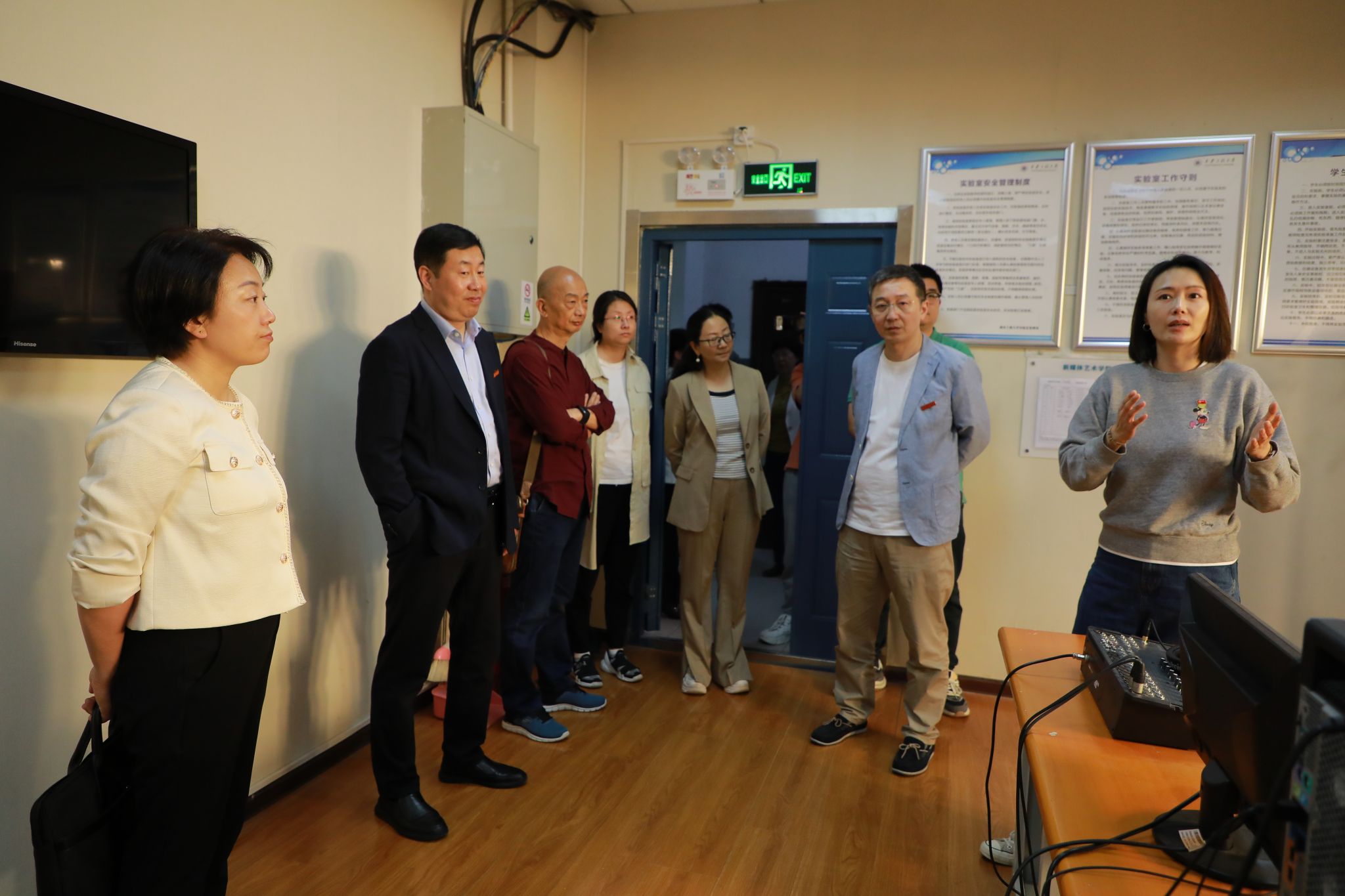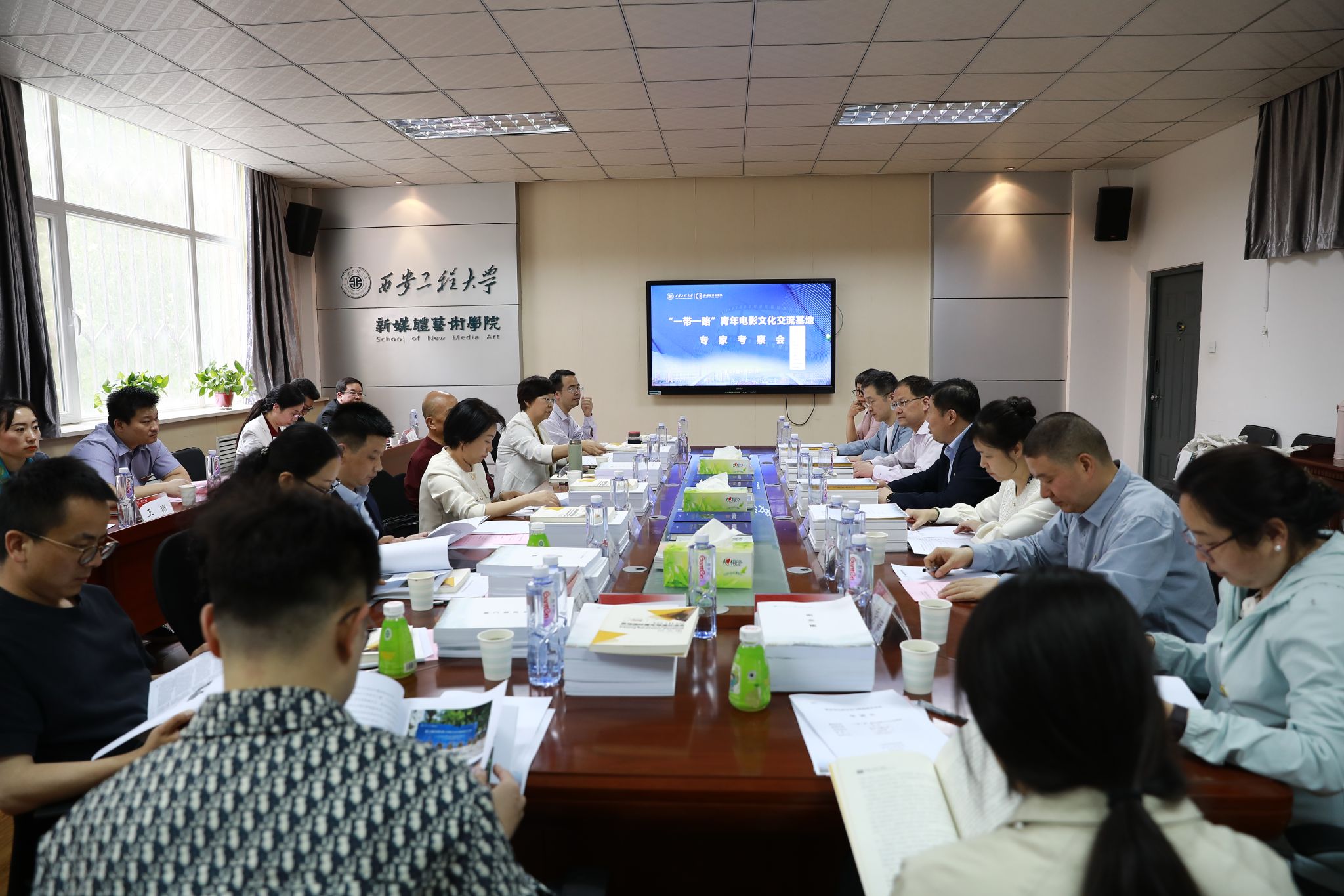 考察组实地察看了基地的工作场所、配套科研设施及共享平台资源,随后听取了基地建设情况的汇报并进行了专家意见交流反馈。基地首席专家马冬教授从基地的建设思路、研究团队概况、前期工作和成果、科研设施条件、运行制度机制及未来工作规划几个方面向与会专家进行了汇报。专家在交流时对基地的工作提出了积极的意见和建议。电影处副处长李岩指出要将研究工作与交流实践相结合,聚焦相关研究领域产出标志性成果;陕西师范大学牛鸿英教授指出要把“国际青年导演交流会”做成基地的品牌、学校的品牌更是陕西的品牌;陕西省电影行业协会会长赵安指出基地可与行业协会加强交流合作,关注青年群体相关的电影行业方方面面,抓住年轻人关注的影视现象深入研究。